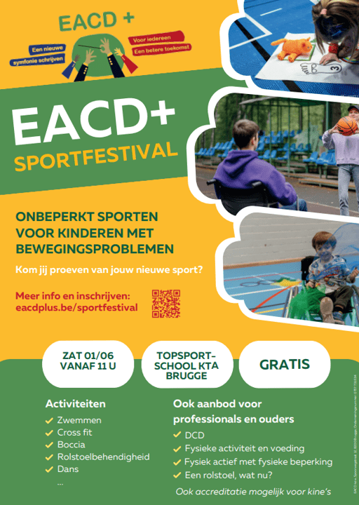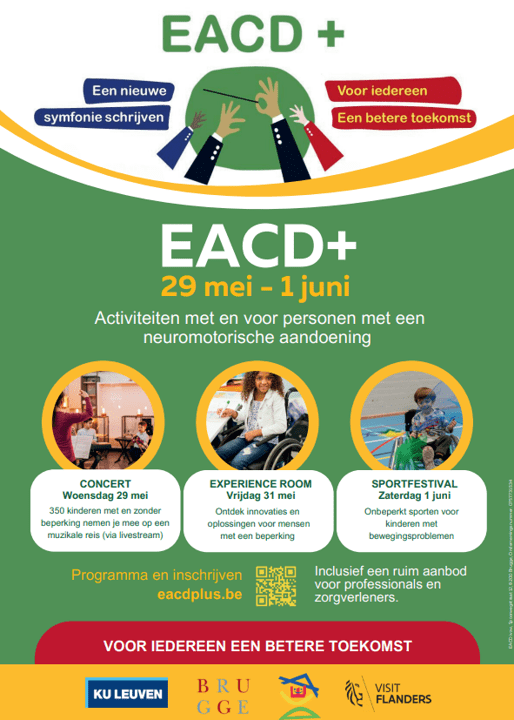 Maar het EACD 2024 congres is zoveel meer dan alleen een congres. Onder het label EACD+ organiseert de vzw – in samenwerking met heel wat partners – tal van breed toegankelijke activiteiten met en voor de doelgroep en dit van 29 mei tot en met 1 juni. Ook familie, vrienden, zorgverstrekkers, therapeuten, beleidsmakers,… kortom iedereen met een hart voor inclusie en met een (al dan niet professionele) betrokkenheid bij neuromotorische aandoeningen is welkom.