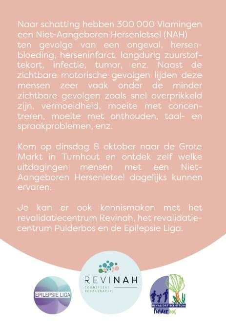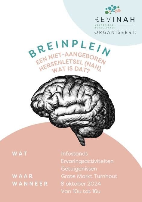 Op 8 oktober kan je op de Grote Markt  van Turnhout deelnemen aan Breinplein: een niet-aangeboren hersenletsel (NAH), wat is dat?
