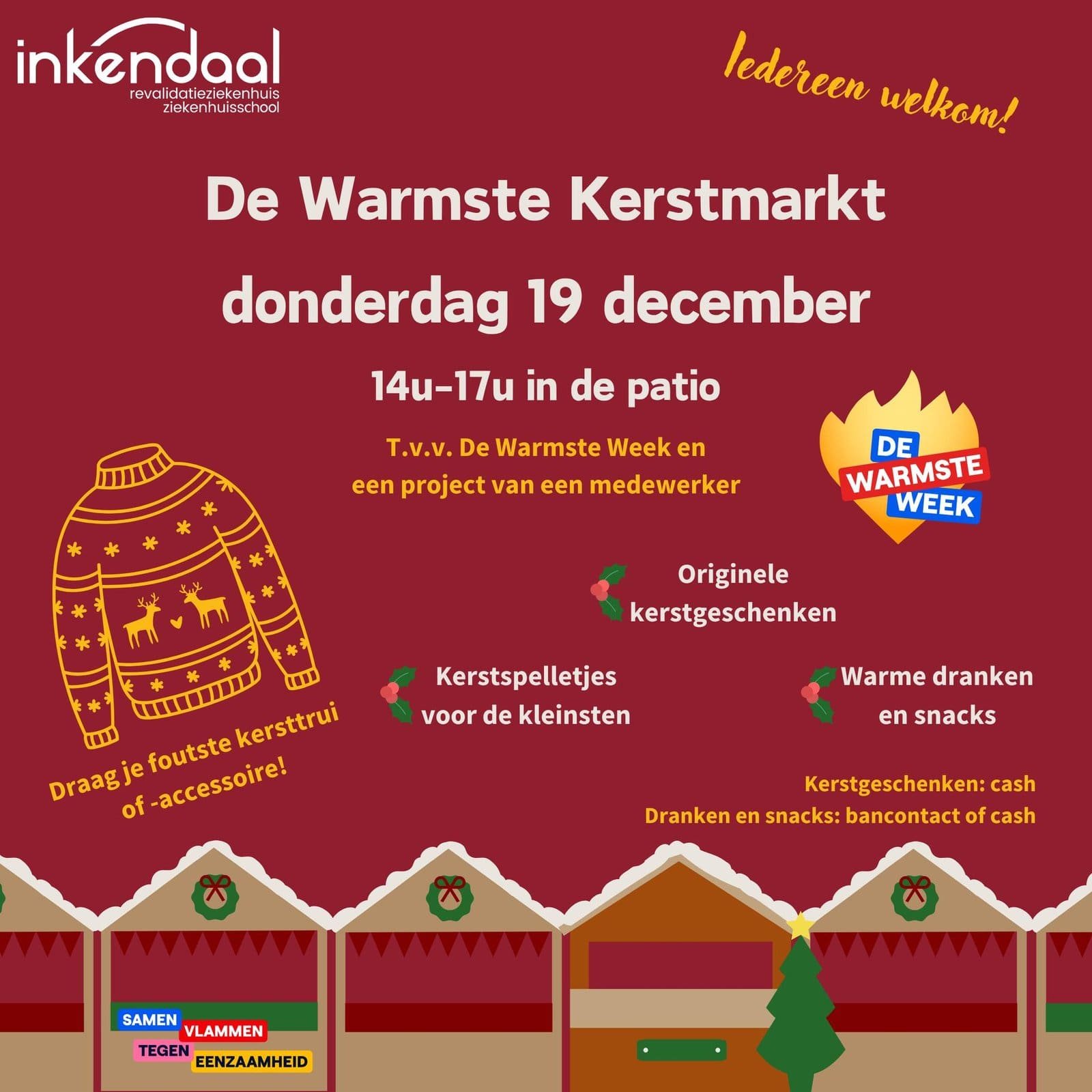 Revalidatieziekenhuis Inkendaal nodigt jullie van harte uit op De Warmste Kerstmarkt, ten voordele van de Warmste Week en een sociaal project waar een medewerker nauw bij betrokken is.